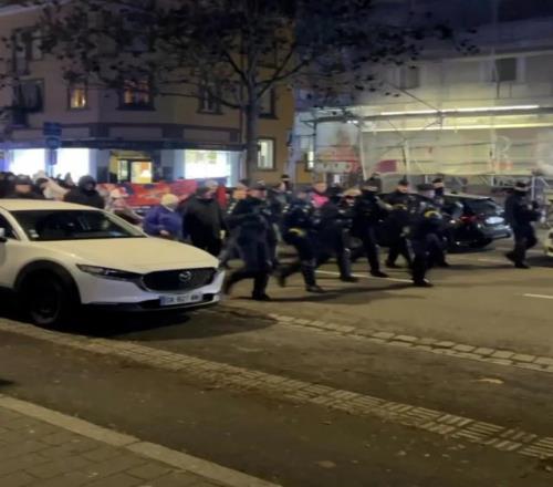 警笛声在寒冷的街道上回荡,视频中可见水晶宫球迷手持旗帜和围巾,穿行在斯特拉斯堡市区。