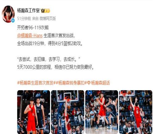赛后,杨瀚森工作室发表微博:“去尝试,去犯错,去学习,去成长。”
